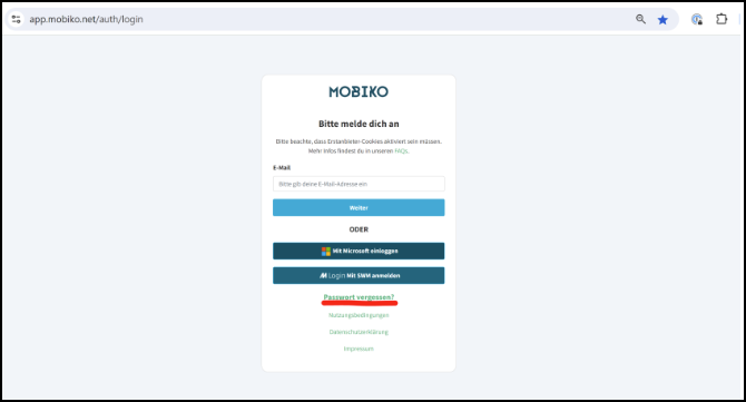 Möglicherweise hast du eine andere E-Mail-Adresse eingegeben als die, die in MOBIKO hinterlegt ist – zum Beispiel deine private anstelle der Firmen-E-Mail-Adresse.