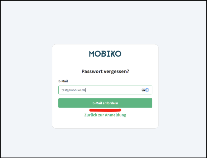 Nutze die E-Mail-Adresse, mit der du bei MOBIKO registriert bist (in der Regel die geschäftliche), und klicke auf „E-Mail anfordern“: