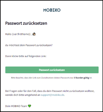 - Der Link zum ZurĂĽcksetzen ist 3 Stunden gĂĽltig. Danach bitte den Vorgang erneut durchfĂĽhren oder eine kurze Mail an support@mobiko.de