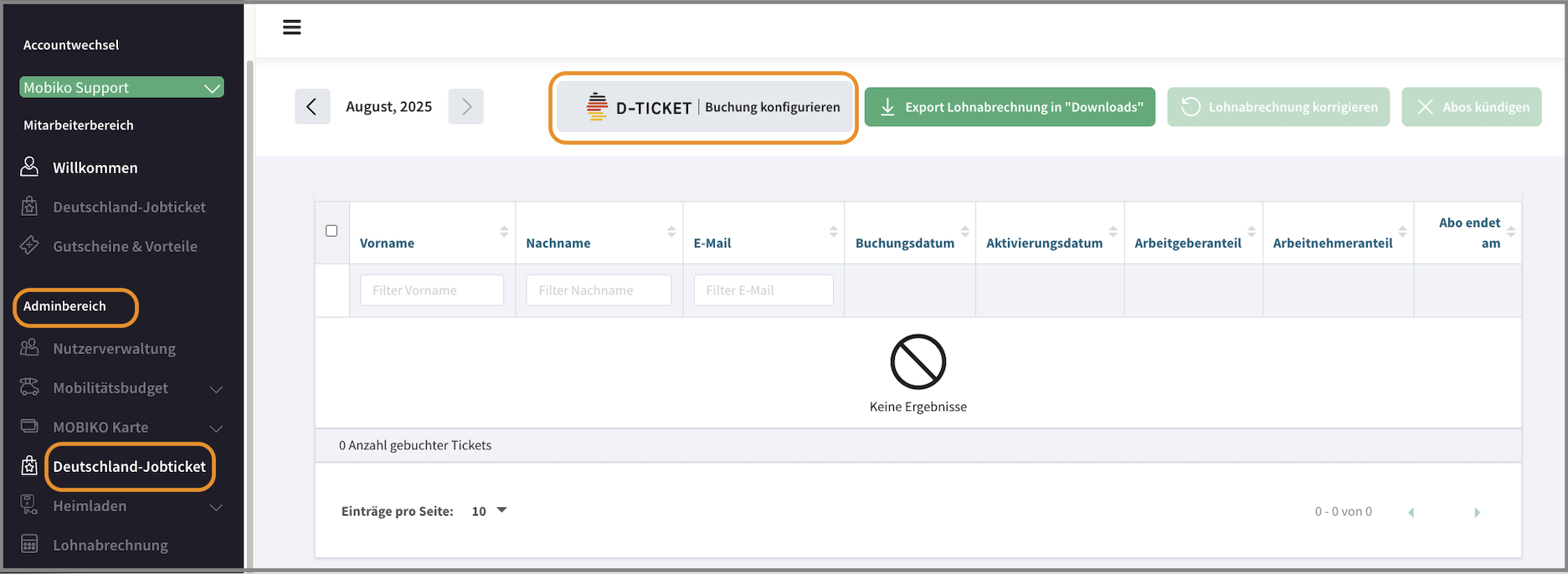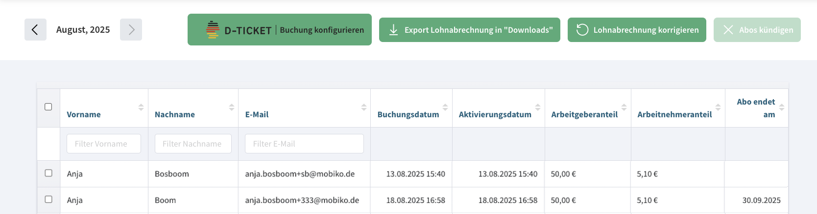 Als Administrator können Sie im Bereich "Deutschland-Jobticket" in der Übersichtstabelle die gebuchten Jobtickets der Nutzer sehen.