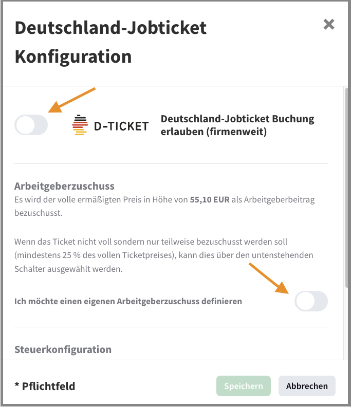 Nun öffnet sich eine Bearbeitungsmaske, in der Sie das Deutschland-Jobticket aktivieren und konfigurieren können. Um das Deutschland-Jobticket zu aktivieren und die Konfiguration durchführen zu können, schieben Sie den Regler von links nach rechts.