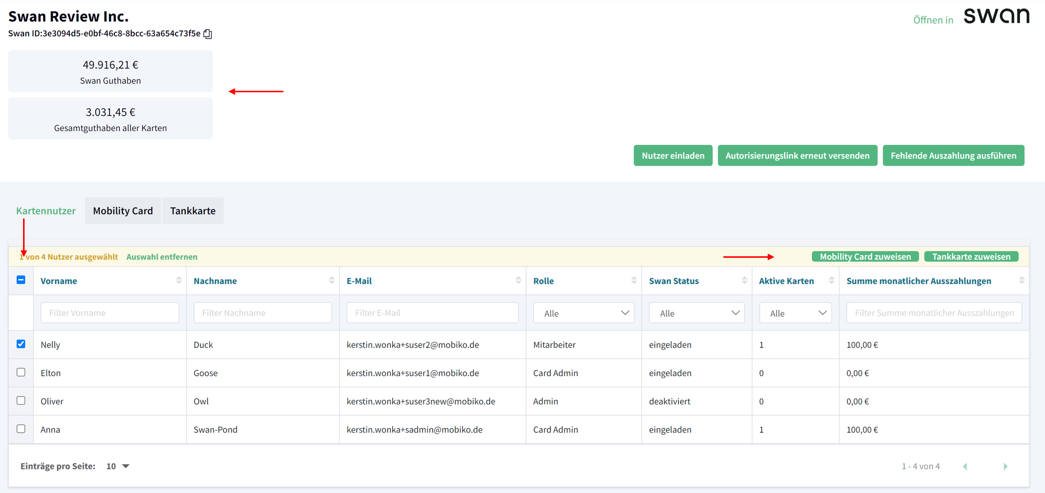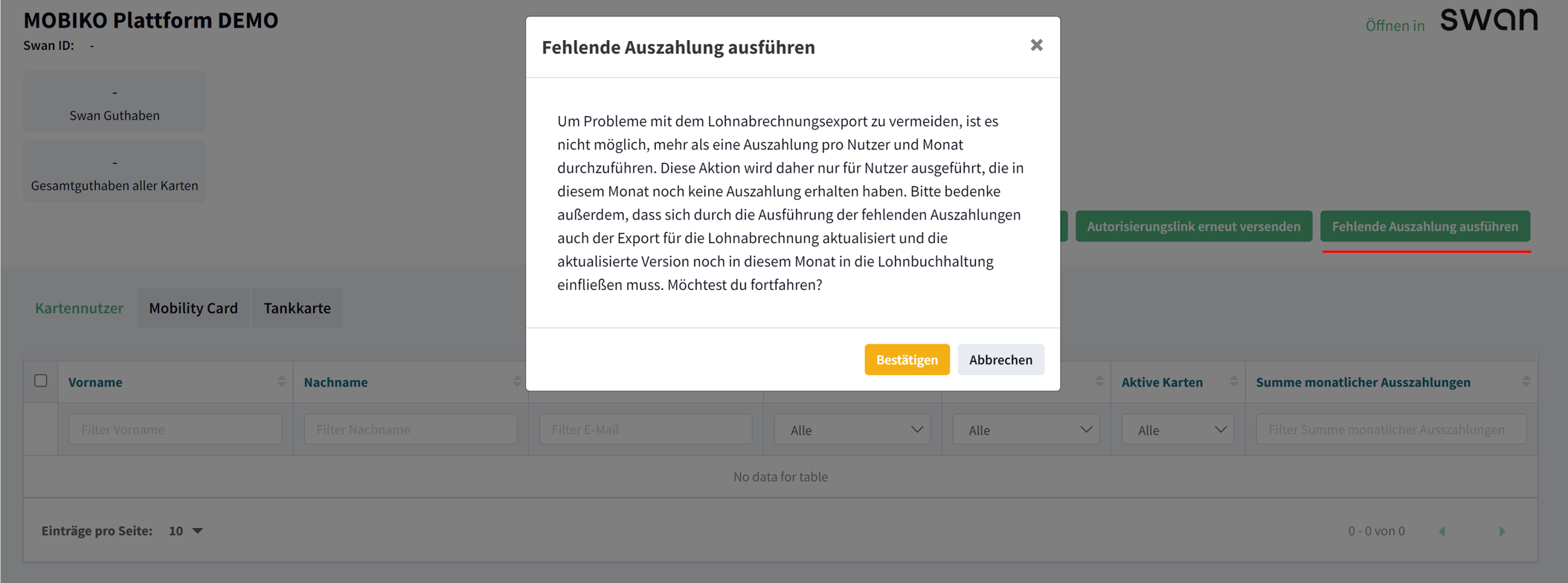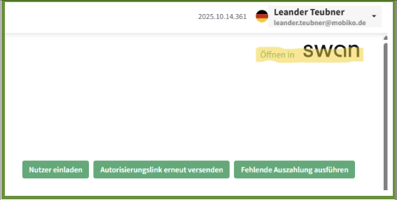Bitte beachten Sie, dass Sie das Swan Guthaben regelmäßig überprüfen müssen, ob genügend Gesamtguthaben für alle Mitarbeitenden vorhanden ist. Bitte überweisen Sie den Betrag selbstständig an Ihre Swan Kontodaten welche Sie im Swan Dashboard finden. Über MOBIKO gelangen Sie direkt zum Swan Dashboard.