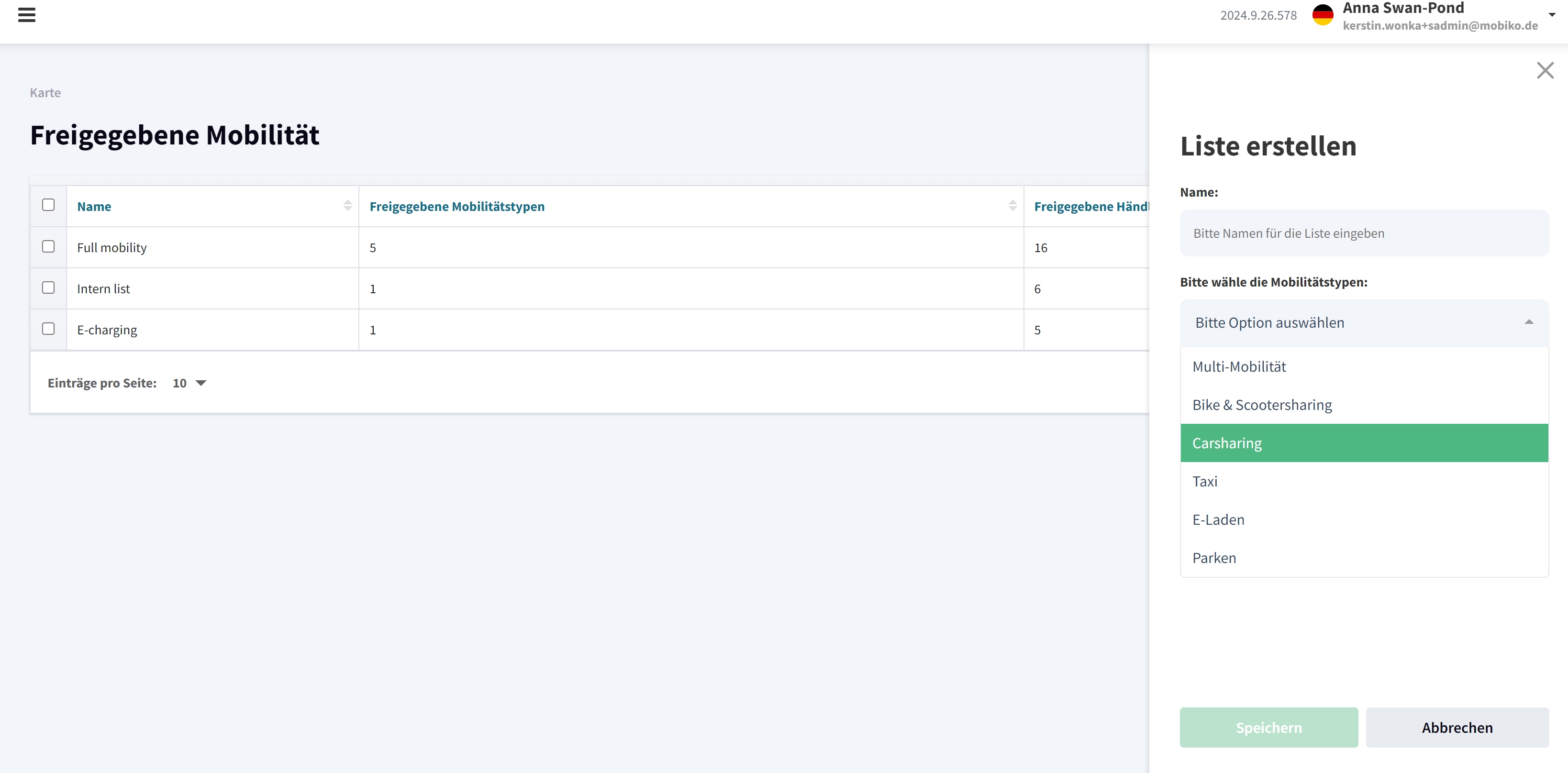 Anschließend geben Sie Mobilitätsarten frei, indem Sie eine neue Liste erstellen, einen Namen für diese Liste erstellen und Mobilitätstypen auswählen.