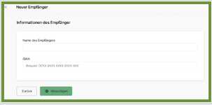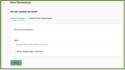 Einen „neuen Empfänger“ auswählen und Bankkonto Details eingeben, oder zuvor hinterlegte Empfänger unter „gespeicherter Begünstigter“ auswählen.