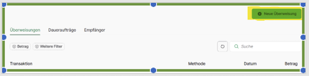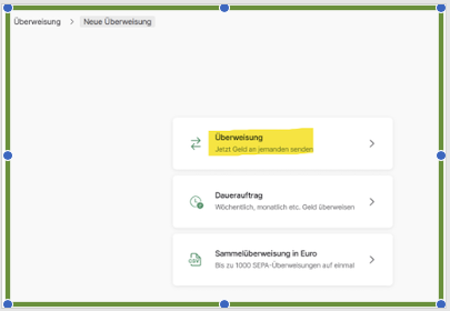 Neue Überweisung: Reiter „Überweisung“ öffnen, oben rechts, auf „neue Überweisung“ klicken.