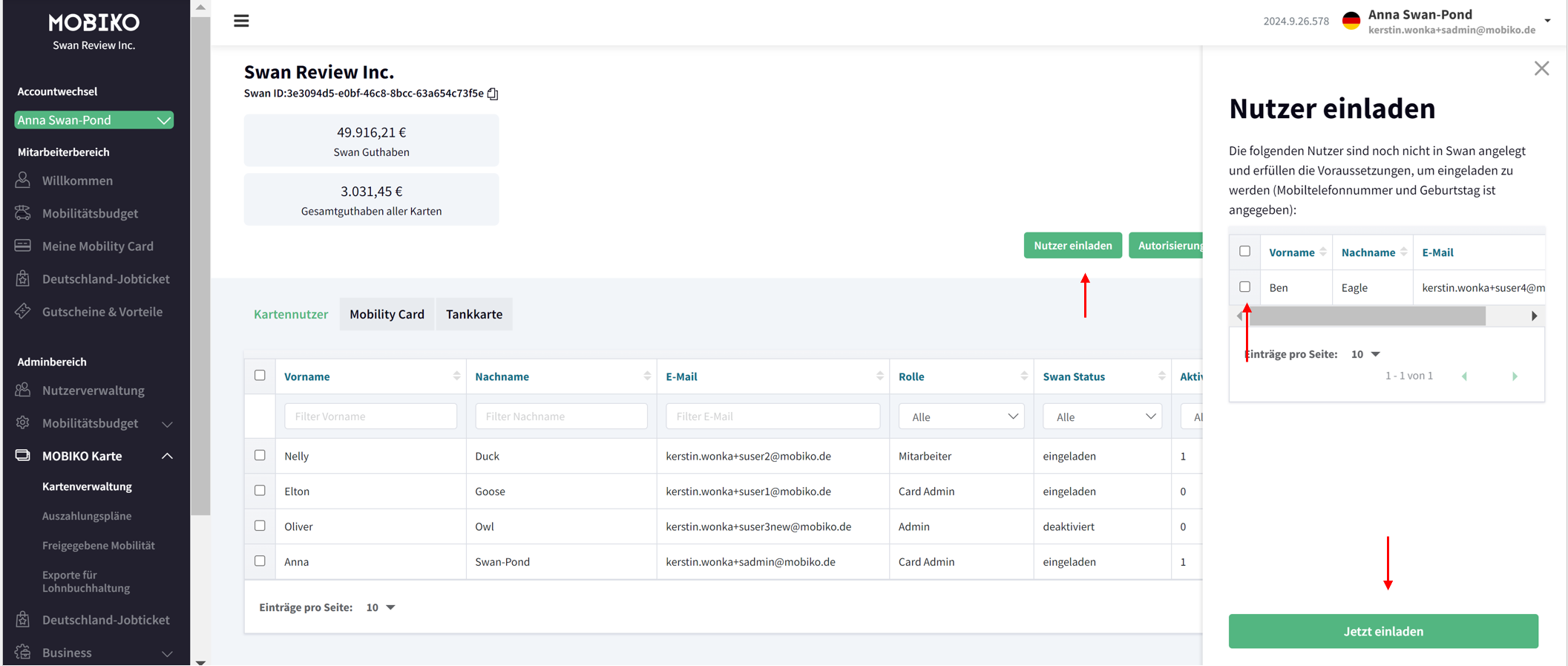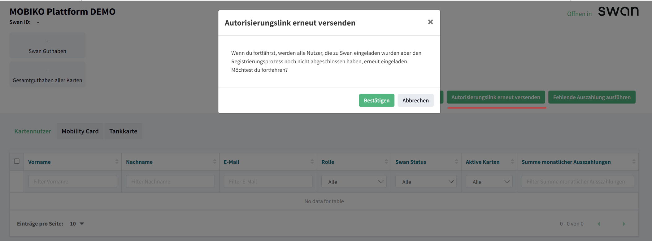 Bitte beachten Sie, dass Sie das Swan Guthaben regelmäßig überprüfen müssen, ob genügend Gesamtguthaben für alle Mitarbeitenden vorhanden ist. Bitte überweisen Sie den Betrag selbstständig an Ihre Swan Kontodaten welche Sie im Swan Dashboard finden. Über MOBIKO gelangen Sie direkt zum Swan Dashboard.