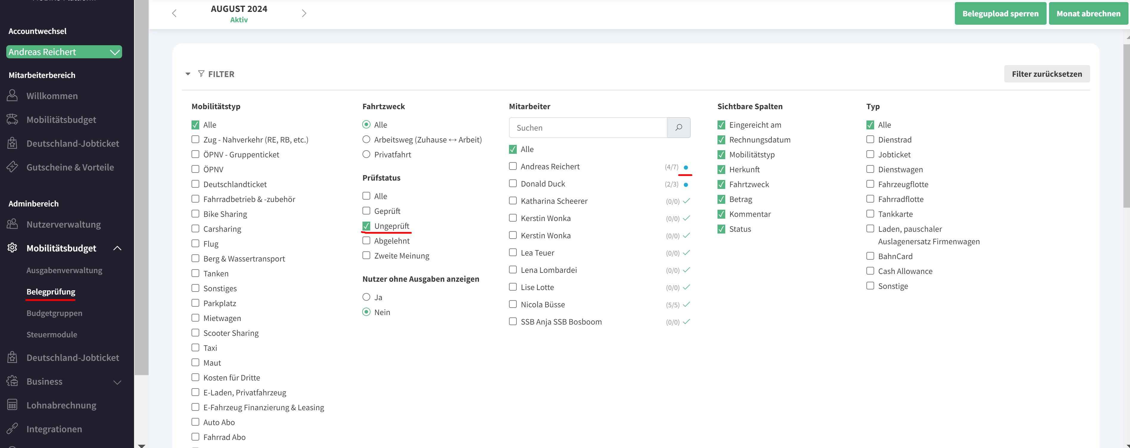 Haben Sie sich nicht für die Belegprüfung entschieden, können Sie selbst entscheiden ob alle Ausgaben freigegeben werden sollen oder nur ein Teil der Belege geprüft werden soll. Eine gesetzliche Vorgabe gibt es hierbei nicht. Es empfiehlt sich jedoch zumindest die steuerpflichtigen Mobilitätsausgaben vor Monatsabschluss vollständig zu prüfen.