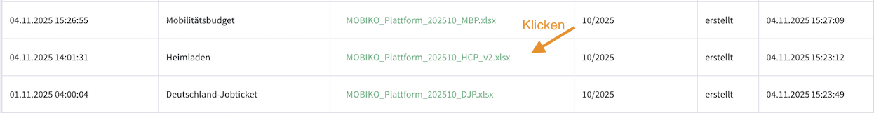 Home Charging Manager: da Ladeaktivitäten, die im Vormonat eingereicht wurden, erstattet werden, findest du hier den Export, der Ladeaktivitäten aus dem vergangenen Monat enthält und in die Gehaltsabrechnung dieses Monats einfließen muss. Die Datei steht spätestens ab dem 08. eines jeden Monats zur Verfügung. Solltest du sie eher benötigen, kontaktiere bitte den MOBIKO Support.