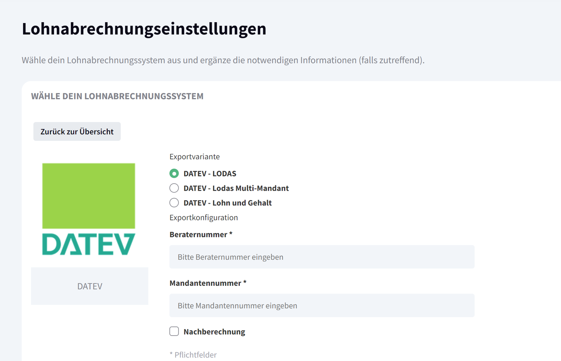 Bitte beachten Sie, dass Sie ggf. lohnabrechnungssystemspezifische Angaben eingeben müssen