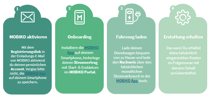 Die Abrechnung erfolgt bequem über die MOBIKO App: Mitarbeitende laden ihre E-Autos an einer selbstgewählten Wallbox und erfassen dort ihre Lade- und Stromkosten basierend auf ihrem individuellen Stromtarif. Alle Nachweise werden digital übermittelt, gebündelt und monatlich als Datei an das Unternehmen übergeben – fertig zur Integration in die Lohnbuchhaltung. Die Erstattung erfolgt direkt über die Gehaltsabrechnung.