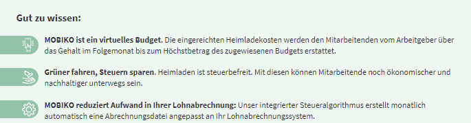 Mit dem MOBIKO Heimlademanager steht Unternehmen und Mitarbeitenden eine moderne und effiziente Lösung zur Verfügung, um Heimladekosten einfach, flexibel und nachvollziehbar abzurechnen.