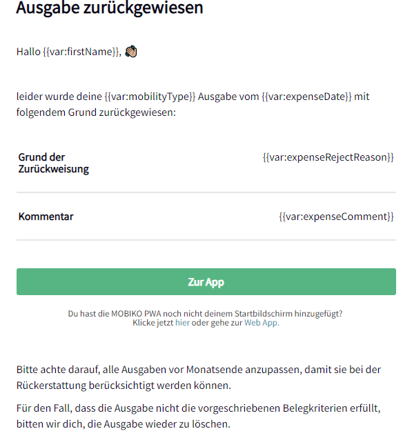 An die hinterlegte (Firmen-) E-Mail-Adresse erhältst du dann folgende Nachricht, wenn deine Ausgabe zurückgewiesen wurde. Meistens auch mit einem Kommentar des Belegprüfers, inwieweit du Korrekturen vornehmen musst/kannst: