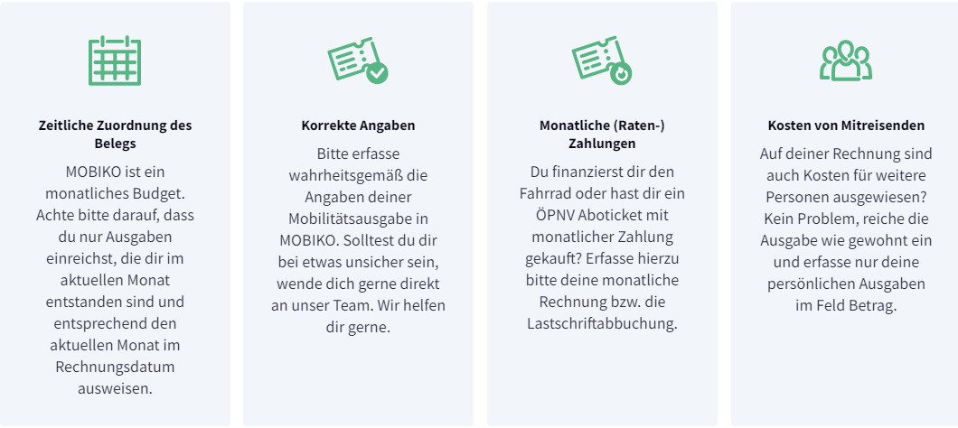 Voraussetzung ist eine wahrheitsgemäße Angabe, dass die Leistung selbst in Anspruch genommen wurde, die Ausgabe einen Mobilitätsbezug erfüllt und bisher noch nicht erstattet wurde, weder im vergangenen Monat, noch über die Reisekostenabrechnung.