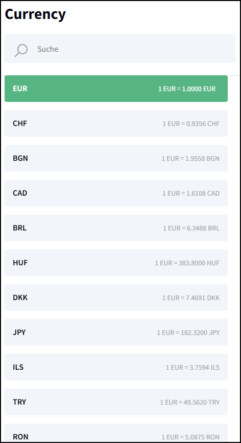 Bei ausländischer Währung kann ein Umrechnungskurs (der EZB) durch Klick auf das € Zeichen vorausgewählt werden