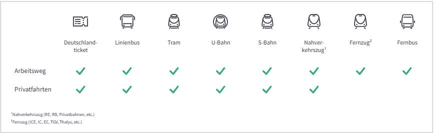Hierzu zählen die Fahrten zur Arbeit und sonstige private Fahrten. Nutze einfach sämtliche öffentliche Verkehrsmittel in Deutschland, wie etwa Bus, Bahn, Tram oder Fernbus und bekomme mittels MOBIKO schnell und unkompliziert deine Mobilitätskosten in maximaler Höhe deines Mobilitätsbudgets zurückerstattet. Das Beste daran: der Zuschuss zum ÖPNV ist 100% steuer- und sozialabgabenfrei, so dass du deine ÖPNV-Ausgaben Brutto = Netto rückerstattet bekommst.