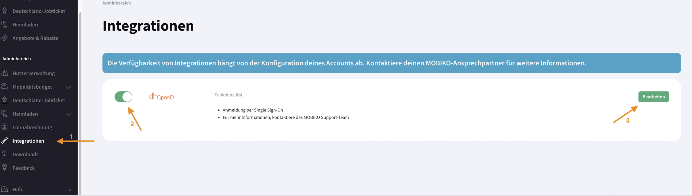 Gehen Sie in Ihr MOBIKO Unternehmensportal- navigieren Sie im Admin-Bereich zum Menüpunkt "Integrationen"