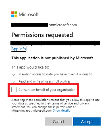 - Sie gelangen auf die Seite "Zustimmung gewähren" von Microsoft und setzen hier im Feld "Consent on behalf of your organization" den Haken zur Aktivierung. Nach dem Speichern mit Accept hat der IT-Administrator im Namen Ihres Unternehmens die Erlaubnis zur Nutzung von SSO gegeben.