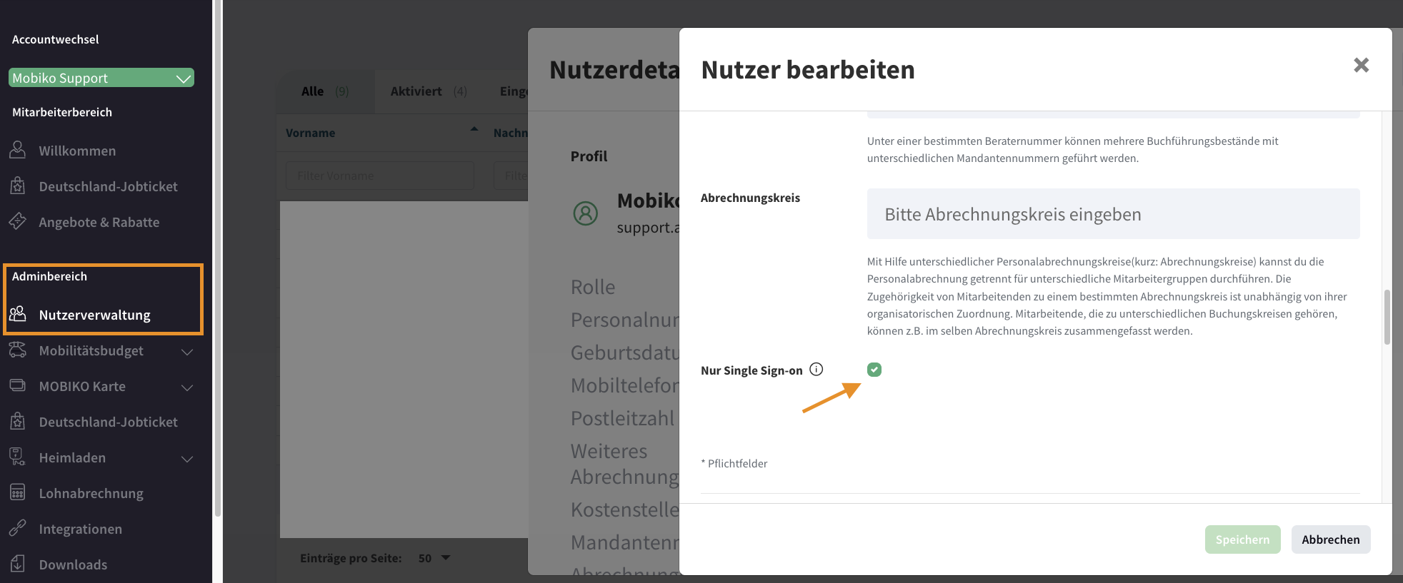 - Im ersten Schritt setzt ihr IT-Administrator die Berechtigung für SSO. Der IT-Administrator muss hierzu nicht im MOBIKO Account angelegt sein. Die Schritte sind wie folgt: